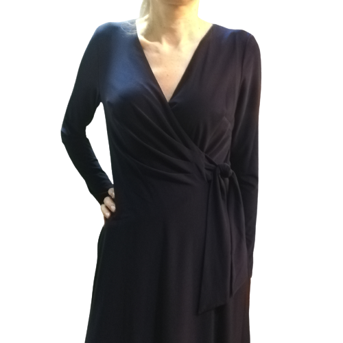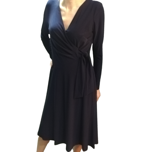Дамска елегантна рокля на мярката RALPH LAUREN. Модел тип - прегърни ме. Връзки които пристягат в талията и деколтето. Изработена от плътен еластично трико, което прекрасно моделира тялото и прикрива успешно недостатъци в областта на талията и ханша.
